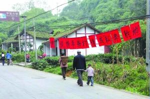 昨日,成都市民顾益在平乐古镇游玩时,当场被一条标语“雷”倒。一张红纸上用毛笔写着斗大的黑字:“建议将平乐打造成‘私奔胜地’”。而附近的村民更是说:“我们这儿要申请私奔之城的名号。”