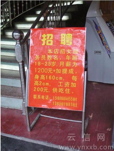 昨日,昆明市民杨先生致电记者称,其路过一动漫城时,发现一个很“牛”的招聘信息。中午11时,记者来到该动漫城门口看到,一块红色的招聘板上,写有如下信息:本店招女服务员数名,年龄18-25岁,月薪为1200元+提成,身高160cm,每高2cm,工资加200元,供吃住。杨先生所说的“牛”,说的是信息最后,身高与工资的关系。