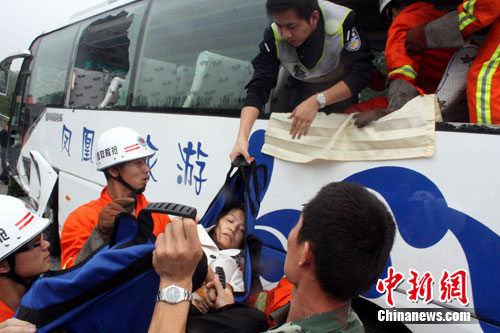 经调查,该车车辆单位为青岛凤凰岛运输有限公司,核载39人,实际载客28人,均为湖南怀化洪江县游客,刚在绍兴游完出来,准备走杭州湾跨海大桥去上海世博会。驾驶人陈某目前正接受交警部门的调查。