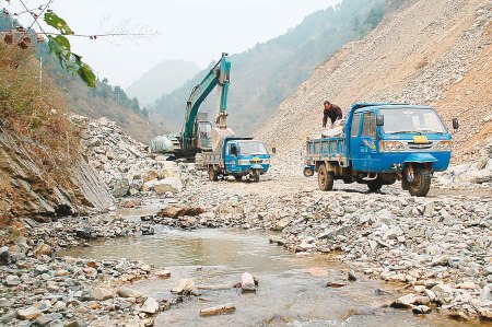 10月18日,记者在高坝镇过凤楼村北沟组附近的山沟里看到,河道几乎全被垫上了大小不一的废弃石渣,在半山腰上,一辆大型挖掘机正在进行采挖,山下另一辆挖掘机和四五辆机动三轮车正在拉运石头。
