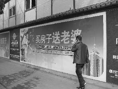 19日下午2时许,记者赶到现场看到该楼盘正在施工,路东墙上确实贴着一圈醒目的广告语,有“买房子送孩子”、“买房子送老婆”、“美人计:房子比男人可靠”等字样,引起不少路人驻足观看。