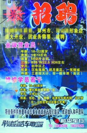 昨日,郑州网友“酷车”发帖称,郑州市区嵩山路与西站路交叉口有一家电动车行正在招聘员工,但应聘条件“苛刻”。