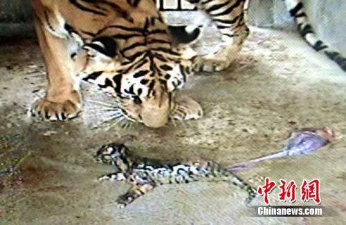 “公主”先是小心翼翼地用嘴将两只小虎崽叼放在一起,极其温柔地舔着自己的小宝贝,两只小虎崽都发出响亮的叫声。“公主”一会儿围着两只小虎崽打转,一会儿又舔一下小虎崽,很慈爱的样子。可几分钟后,不知出于什么原因,它却只管给其中的一只小虎崽喂奶,对另一只不理不睬。