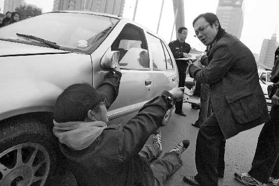 一对情侣目睹了事情的整个过程,“人家抓住车窗,司机就不应该再启动汽车。”处理这件事情的交警牛根荣说,先把伤者送到医院,双方可以协商解决这件事情。(记者赵磊)
