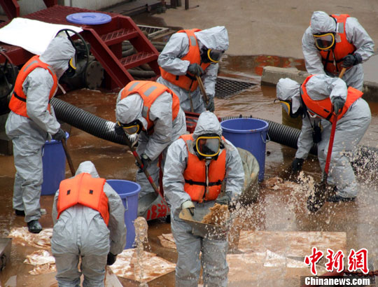 中新社宁波11月2日电(何蒋勇)今天上午,由交通运输部海事局组织的中国有史以来规模最大、专业性最强的一次专项散装化学品泄漏综合模拟应急处置——2010年宁波港散装化学品泄漏应急演习在宁波港镇海港区海域成功举行。