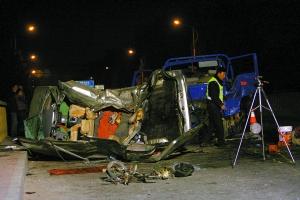 交警在事故现场勘查。昨日17时40分许,京良路京良环岛2公里处发生一起多车连撞事故,4人死亡6人受伤,交通受阻4个多小时。据伤者回忆,事发时,一辆面包车自西向东行驶,试图加速超车时,撞到一名骑自行车男子。随后,面包车急打方向盘进入对面车道,与一辆轿车相撞,紧接着又与一辆货车相撞。本报记者 吴江 摄