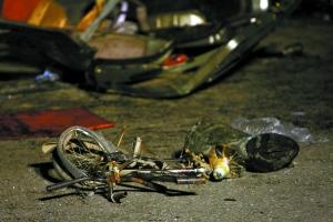 事发地点位于京良环岛向东2公里左右的一座桥上。昨晚9时许,一辆自行车、一辆面包车和一辆小货车依次停靠在由东向西方向车道上。面包车侧翻,顶部撕开,留有大摊血迹。一辆右部受损的黑色轿车停在前方10余米处。