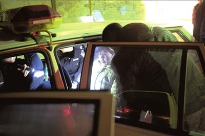 3.一名嫌疑人被带上警车。
