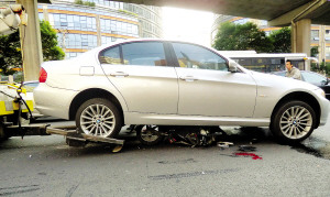 据目击者介绍,事发时,这辆牌号为沪H的银灰色宝马轿车沿曲阳路由北向南行驶,至东体育会路附近时与一辆电瓶车发生碰撞。电瓶车被撞倒,骑车的中年男子当场倒地。30多岁的女司机在慌乱中或许错将油门当成了刹车,轿车猛冲向前,将电瓶车一路往前推行数米远。最终,男子连人带车被卷入轿车底盘,轿车则卡在电瓶车上,后轮腾空,车身动弹不得。