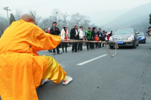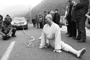 昨日(18日),年逾5旬的慧龙法师在潭柘寺山门外,表演了徒手拉动6辆小轿车的功夫。