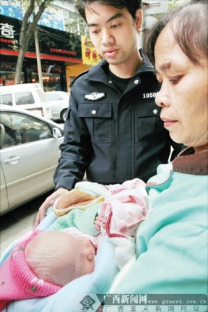 “宝宝,妈妈不负责任生下了你,一个人没有能力养你,妈妈对不起你……”昨日上午,一名一个多月大的男婴被抛弃在南宁市民乐路一家临街铺面旁。遗弃的现场除了一袋婴儿服装外,还有一个装3900元现金的信封。接到报警后,南宁市公安局兴宁分局兴宁派出所民警赶到现场后,将男婴带走,并对此事展开调查。