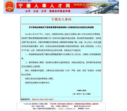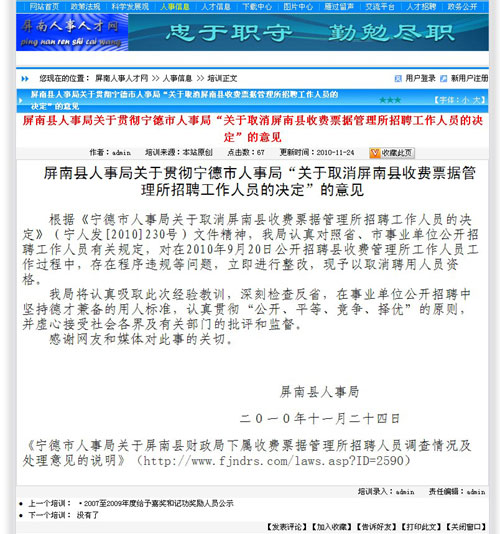 中共屏南县委、屏南县人民政府获悉有关网站反映县财政局收费票据管理所招聘人员中存在的问题后,11月24日,县委、县政府果断采取措施,责令县人事局取消此次招聘行为,退回被聘人员。同时要求县纪委、县监察局开展调查,视其情况依法依规对有关人员进行处理。