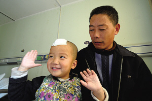 昨天上午,当记者赶到省立医院西院时,患病的胡祥文正静静的躺在床上。记者发现,孩子的脑袋有些大,胡明良告诉记者,这是因为胡祥文脑部积水造成的。