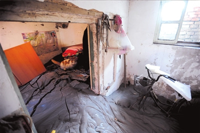 昨天中午,记者在杨先生家中看到,遭“泥封”的房屋约15平方米,里屋的泥浆高约1米,通过房门涌入外屋。已凝固的泥浆表面光滑,有些地方开裂。
