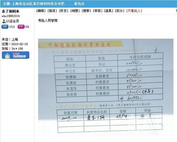 日前,一则名为“上海市宝山区某行政村村务公开栏”的帖子在KDS等本地论坛迅速蹿红,引发网友热议的是一张摄于“干部报酬及相关费用支出”的照片。照片中,“村干部劳动报酬分配及补贴”栏内标注:名为“唐云忠”的书记年终分配报酬为226801元,另一名为“申江生”的副书记、主任报酬为181440元,其余4人分别为支部委员和村委委员,6名村干部的年终分配总金额超过60万余元。