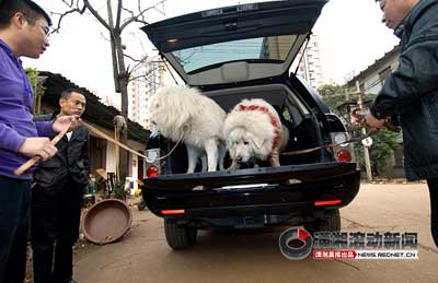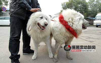 昨日下午三点,一支由路虎、奔驰等豪车组成的车队开至黄花机场,车上还系着红绸,过路的人都以为是支迎亲队伍,其实不然,车队是到机场接两只雪獒,“玉龙”和“雄风”,它俩刚从北京飞抵长沙。“玉龙”是中国畜牧业协会认定的国家A级种公雪獒,价值680万。