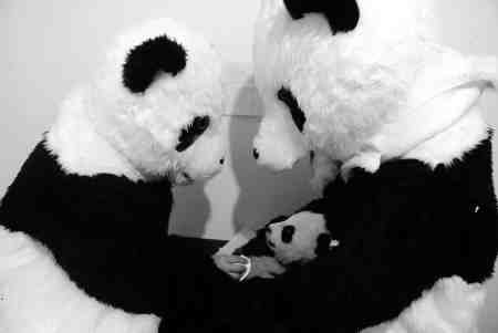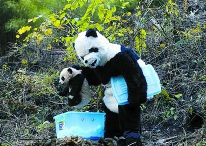 分工完毕,上山抱小宝宝下山的牟仕杰和吴代福,以最快速度全副武装,从头到脚,只剩下黑白两色,活脱脱一个站立起来的大熊猫。
