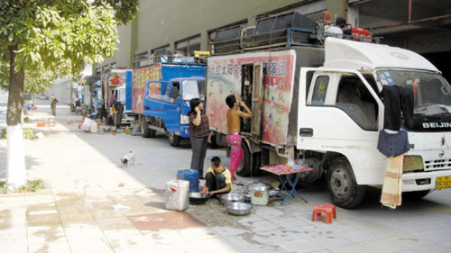 本月5日中午1时,记者在望牛墩路口看到,十余辆车身绘着不同杂技团名称和大幅剧照的卡车一路排开,场面颇为壮观。正是午饭时间,许多剧团成员三五成群地蹲在路边吃饭。他们的午饭是用随车携带的炊具自己烹制的,饭菜非常简单,青辣椒里夹杂几片肥肉,就算是唯一的荤菜。