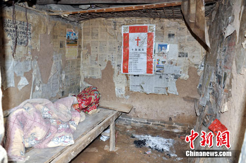记者在杨少朋家看到,三间残缺不全的土房,只有一间勉强还能够避风遮雨,院子没有厨房,卧室没有挡风门。黑洞洞的屋中除了一张破木板上放了两条破被子之外,别无它物。