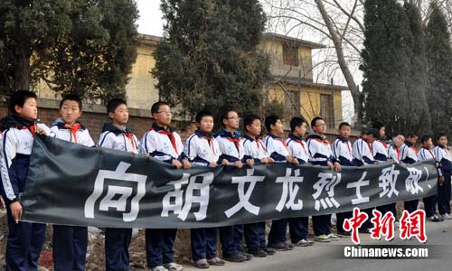 中新网秦皇岛12月10日电(王宝德 李晓霞)10日下午,隆冬的河北山海关大地寒气袭人。“沉痛悼念胡文龙烈士”、“战友,我们接你回家”、“浩气长存,英魂永在”等一幅幅挽帐挂满秦皇岛烈士陵园。