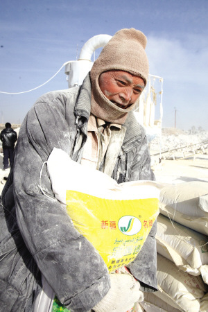 距佳尔思厂的粉碎机器十米开外,堆放了大半圈约3米高的做大白粉原料的石材,爬上原料堆,工人们工作的场景清晰可见。一位身着红色破夹袄的工人,将榔头高高举过头顶,喊着“嘿!嘿!”的号子,砸向三四十厘米见方的原料石;装车工呆在一边,看石头被砸成小块后略略停顿便直挺挺地弯下腰,一块块捡起缓缓地转身,扔进手推车。两人配合装满一车手推车原料石,花了近半个小时。不远处,有工人步履蹒跚地推着手推车,将原料石运到机器旁,等待机器修好后进一步加工。旁边一位装车的工人铲一铁锨石头,顿一下,看看手套;再铲一铁锨,又停顿一下,提了提系着尼龙绳的裤子,又开始工作。虽然头上、衣服上落满粉尘,但除了一名工人在鼻子上“挂”着片烂布外,没有一个人戴口罩做防护。