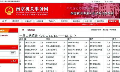 12月12日深夜,南京市级机关事务管理局网站上的“每周菜谱”,被网友截图发布在各大网站上后,引起数万名网友围观,大呼“真丰富、真便宜,菜价贵都是浮云……”