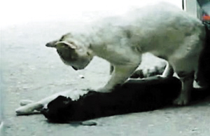 土耳其一只流浪小猫在停车场被汽车撞倒后,无助地躺在地上,同伴随后赶来,用猫掌在昏迷的同伴胸口上心脏按摩,整整2个小时,希望它能够醒过来。