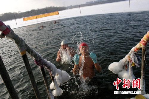 中新网长春12月17日电 (田伟)17日,几百名冬泳爱好者陆续来到长春市南湖公园沙滩浴场参加冬泳。虽然近日来吉林省遭遇低温严寒,长春局部地区达到了零下30余摄氏度,但恶劣的天气并没有挡住冬泳爱好者的脚步,还是一如既往地来体验冬泳乐趣,锻炼身体。