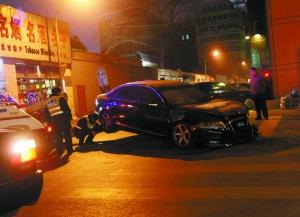 奥迪车被拖至王府井派出所旁,该车司机进入派出所接受调查。据了解,事故未造成人员伤亡。昨晚22时30分许,警方现场勘查人员到场拍照查看。