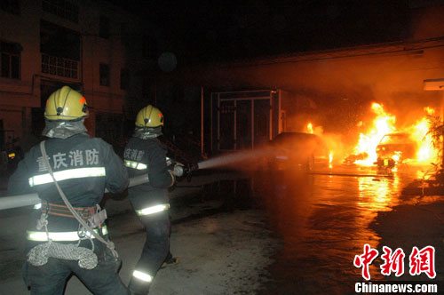 中新网重庆12月20日电(连肖 阮守军)20日晚19时35分许,重庆黔江区交通路舒新汽车修理厂内的停车棚突发大火,3辆轿车和2辆摩托车被烧毁,所幸未致人员伤亡。