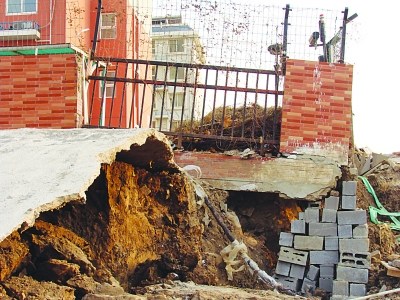 据杰瑞花园物业公司赵经理介绍,今年10月初,东盛房地产公司开始对所建东盛阳光大厦开挖基坑建地下室。10月中旬,居民就发现了靠基坑一侧的围墙、车棚、路面出现裂缝,和施工方口头交涉,但对方并未停工。12月初,5号楼北侧围墙外的基坑护坡塌方滑坡,杰瑞花园西北角的围墙倒塌,杰瑞花园西面相邻的一排民工用房也倒塌掉,对方仍没有停工的意思。直至12月24日,工程才在5号楼业主阻拦下停工。