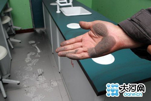 在学校教学楼,记者看到窗台上、墙面上都蒙上了一层厚厚的煤灰,教室地板走过去就印上了清晰的鞋印,据学校老师介绍,这还是早上刚打扫过的。为了防止煤灰进入,教室的窗户现在都换成了双层的,平常都是紧紧关着,除了早上打扫卫生的时要清理凹槽里的煤灰才打开一次,推开窗户往外看便是黑乎乎的煤场。