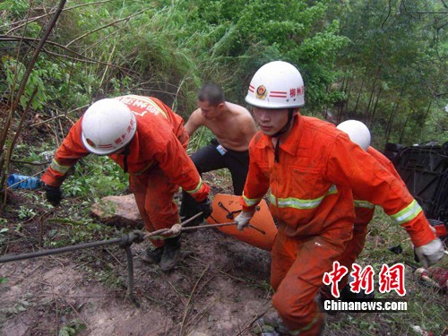 据现场交警介绍,当时车上共有35人,2名司机,33名乘客,其中3名乘客当场死亡,4名乘客重伤,28人不同程度轻伤。车祸发生后乘客已全部被救至车外,正在山沟下等待救援。消防队员首先用一条安全绳伸到山沟下,帮助伤势较轻的乘客爬至高速路上,同时携带多功能救援担架下至沟底,在医护人员的配合下,对重伤的4名乘客和2名中等伤势乘客进行救助。