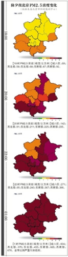 数据显示,2015年除夕夜,北京PM2.5单站最高小时浓度出现在平谷镇,达到1000微克/立方米,这比2014年上升18.9%,与2013年基本持平。去年除夕夜,全市PM2.5均值近700微克/立方米。到了大年初一早晨7时,PM2.5浓度还是保持在400微克/立方米以上的高值。