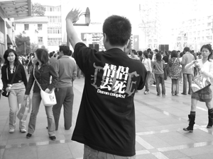 中新网11月12日电 据武汉晨报报道,11日“光棍节”,武汉市30多名青年男女身穿统一服装,在群光广场门口高喊口号反对“物欲爱情”,引来不少异样目光。