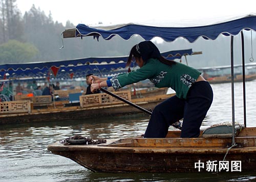 中新网杭州12月14日电(柴燕菲 陈瑜)进入冬天,西湖的绿开始慢慢黯淡,失去了往日的活力。然而,妩媚的西湖船娘们,身着美丽的冬装在湖上悠悠的荡着,给冬日的西湖增添了一份活力。