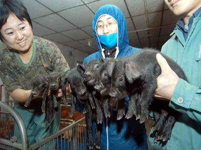 1日元旦,哈尔滨三元畜产实业有限公司种猪场的饲养人员精心喂养6只小克隆猪。其中奶瓶照片为精心喂养体质较弱的两只小克隆猪,保证小猪健康成长。