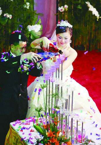 美轮美奂的灯光、浪漫温馨的纱幔,再加上点缀其间的鲜花,把这场婚礼现场称为童话世界一点也不为过,而2005年环球小姐中国赛区总决赛冠军陶思媛就是这个童话世界里的公主。昨日中午,在成都锦江宾馆,这位漂亮的重庆妹子身着婚纱,嫁给了号称成都顶级餐饮店——潮皇阁的老总王奎,成了成都的儿媳妇。