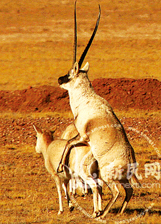 此时,雄性藏羚羊高高昂起头颅,两只“V”字形的长角直指蓝天,两只前腿迈开正步,蹄子使劲儿地叩击地面!这一连串的动作完成以后,它开始静静地认真地靠近自己的情人。它那在地球第三极奔跑的有力的前腿,此时却出奇的温柔,一如男人温暖的大手,轻轻地轻轻地抚摸爱侣的腰际。如此2-3次后,雄性藏羚羊高高跃起,把大半个身子搭在了雌性藏羚羊的背上……两只高原精灵为种族的繁衍结合!