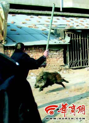 昨日下午,一头野猪闯入陕西延安市区,进入一家饭馆后又冲向杨家岭旁边的一个苗圃中心,延安警方联合林业部门,与几十名市民将野猪围困起来。野猪在两个半小时内几次“出逃”,并咬伤一只小狗,最终被警方和森林公安6枪击毙。