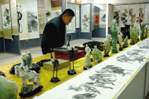 实物展厅设在拍卖大厅楼下。走进展厅,在中间位置一个放满玉器、金器的玻璃柜前人头攒动,不少人边看边记录。展厅四周则挂满字画,吸引着参观者驻足。而挂在展厅一角的裘皮大衣在众多玉器、金器之间特别引人瞩目。