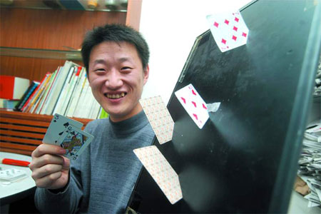 这位叫做刘金龙的大连小伙子不仅可以飞扑克切断香蕉、黄瓜,穿透5张报纸,而且在无风的情况下可以将一张扑克牌甩到6层楼的高度。