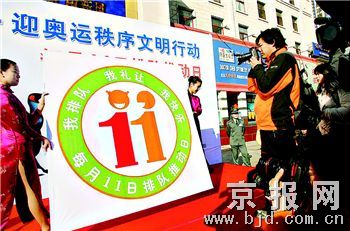 今天上午,“文明礼让排队候车”、“我文明、我礼让、我排队”等宣传语成了出现频率最高、最受市民关注的词汇,首个“排队推动日”活动在全市(注:北京市)各区县上千个重点公交站台、商场、公园、大街等人流密集公共场所同时展开,数十万文明乘车监督员、志愿者和各界人士走上街头,引导市民养成自觉排队的良好文明习惯。首都文明委向全体市民发出了“共创公共文明秩序”的倡议,同时“迎奥运、讲文明、树新风”活动的卡通人物造型和“排队日标识”也首次亮相。