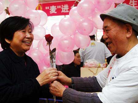谈到为什么要组织这个特殊的情人节活动时,四川麦当劳公关部负责人表示,我们麦当劳的口号就是要永远年轻,所以我们也希望我们的顾客永远保持一颗年轻的心,适逢情人节和新春佳节,所以就想到组织这个活动来丰富一下老年人的生活。(记者蒋亮)
