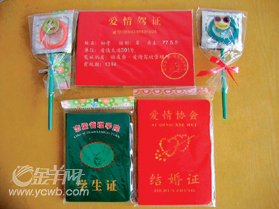 在该店的中心区,许多像学生证一样的小礼品成为当天兜售的主打商品,“炮兵等级证”、“亲密接触许可证”等让人看上去非常扎眼。自称店员的小梁告诉记者,这些像一本本学生证的小礼品里面装的全是避孕套,为了吸引顾客的眼球,他的老板特意跟广州一个印刷包装厂订制了不少避孕套的外包装,做成学生证、奖状、存折、棒棒糖、中国结等模样,售价从8元到38元不等。
