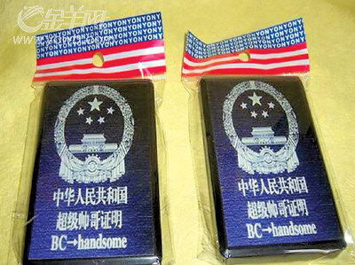 记者看见该“帅哥证”封面显著位置印着我国的国徽图案,国徽下是“中华人民共和国超级帅哥证明”等字样,正是市民邱先生等人投诉的该款产品。