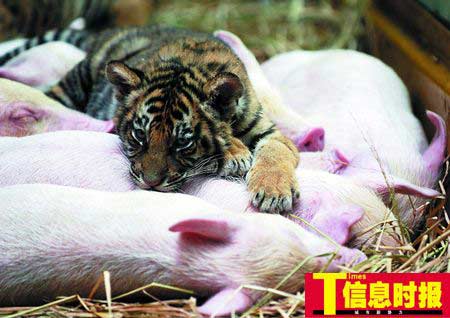 记者了解到,三只小老虎是孟加拉虎,他们的妈妈是第一次生虎仔,由于没有经验,小虎生下来后不久就被虎妈妈遗弃,三只小虎饿得嗷嗷直叫。心急如焚的饲养员想了很多办法,包括人工饲养,但小虎都不太接受,连续几天下来,小虎饿得只剩下皮包骨。最后,饲养员灵机一动:“今年刚好是猪年,我们何不领一头猪过来,看看它能不能喂养小虎?”于是,饲养员买了一头刚刚产下小猪的老母猪,一会来小虎就爬到猪妈妈的身上吸奶,而猪妈妈也没有任何的反抗行为,欣然接受三个“虎儿子”。