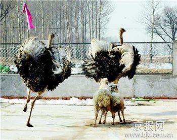“看着这条大狼狗挺凶的,却被这两只鸵鸟欺负得毫无还手余地”。在延庆县康庄镇开了个农家院的刘大姐笑呵呵地对大家说。