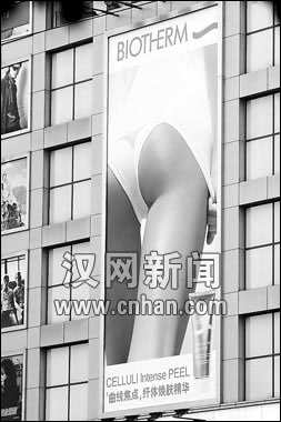 记者随后在该商场门口看到,广告牌面积约30平方米,画面焦点集中一名穿内衣女子的臀部和腿部。照片的下方显示,该产品是一款纤体焕肤精华露。