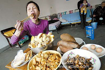 肥肉1斤、点心3块、泡面1袋、烧饼5个、水10斤,还有瓜子……这些食物绝不是进超市前的采购清单,它们仅仅是北京一名瘦弱女子的一顿午餐。今年44岁的秋香,自从4年前开始暴食后,吃对她来说再不是一种享受,以她的食量,吃主食兼喝水,一天至少能吃喝25公斤。